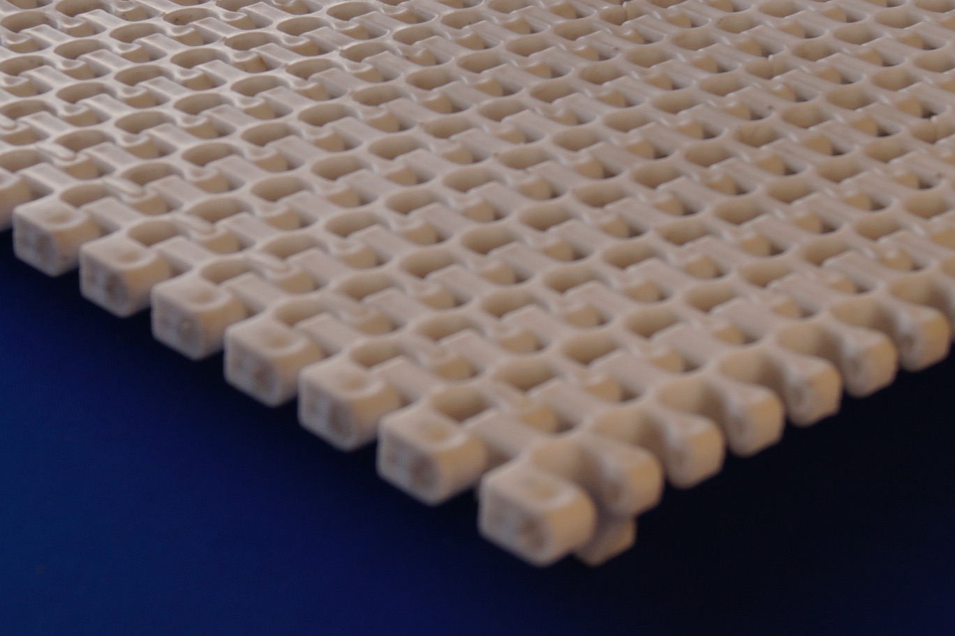 BANDA PLÁSTICA MODULAR CURVA. PUEDE SER INYECTADA EN POLIPROPILENO, POLIETILENO, ACETAL Y NYLON. LA ESTRUCTURA PARA ESTA BANDA MODULAR DEBE TENER UN RADIO MÍNIMO DE 2,2 VECES EL ANCHO DE LA CINTA.