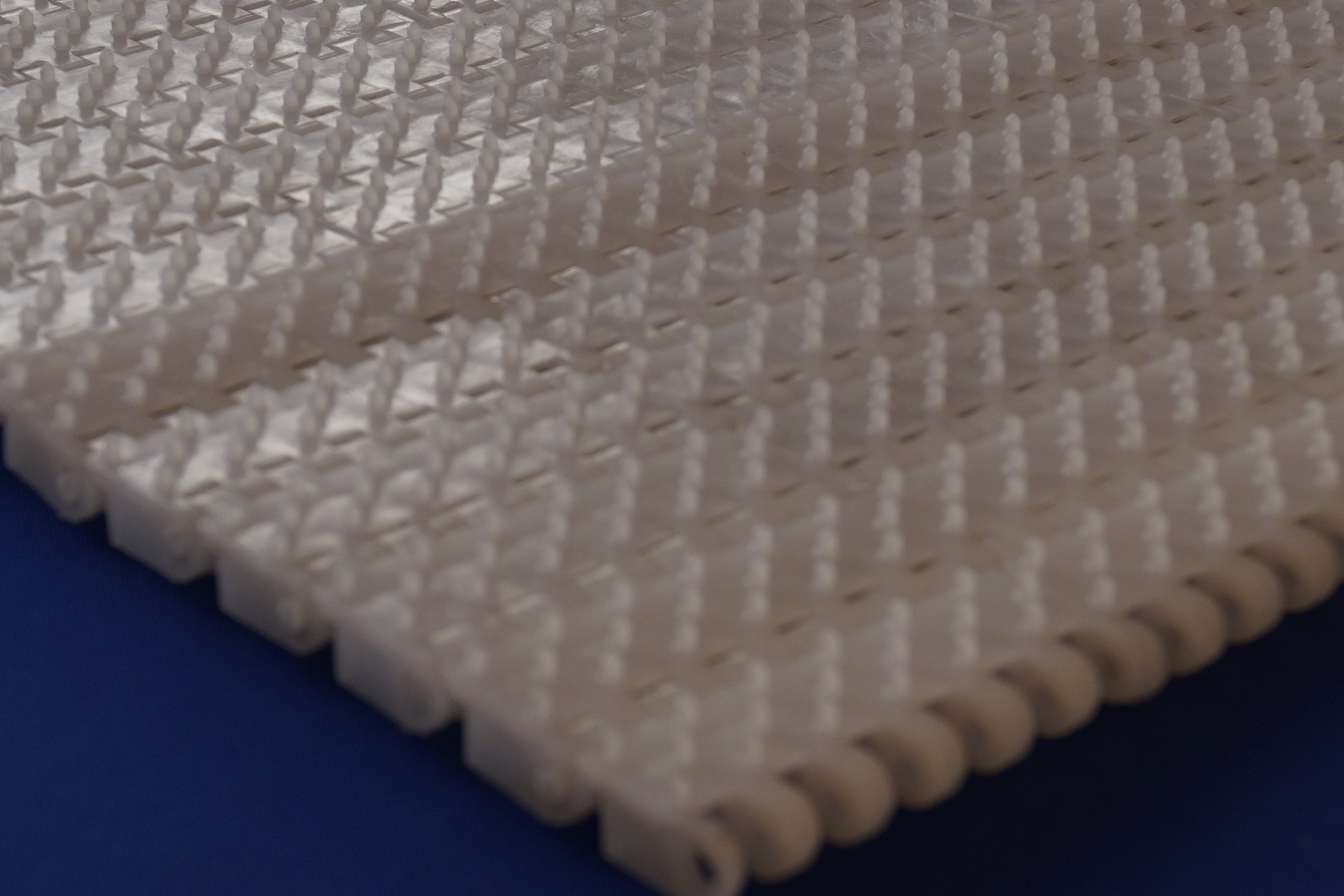 Banda plástica modular serie PBM 25/0 con puas, paso 25 mm y 0\% de superficie abierta. Puede ser inyectada en variados colores y materiales como polipropileno, polietileno, acetal y nylon.