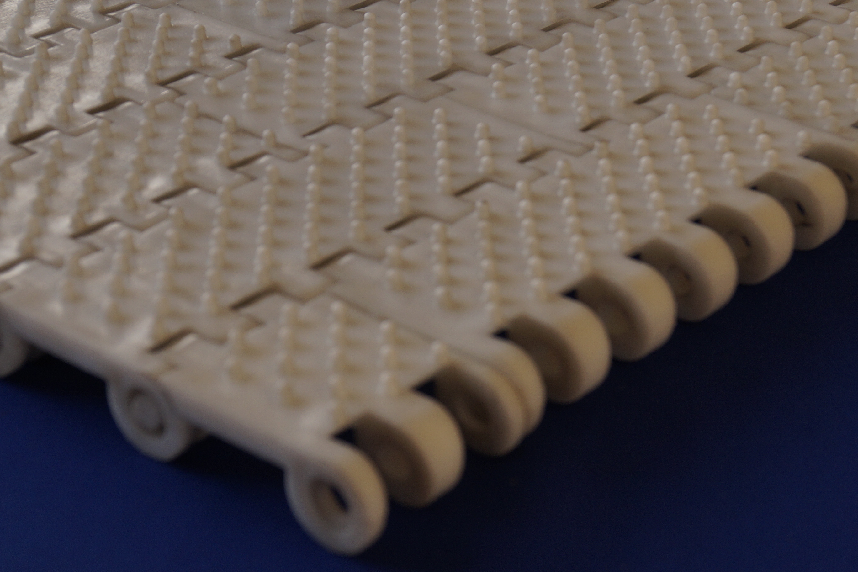 Banda plástica modular serie PBM 50/0 con puas.  Paso 50 mm y 0\% abierta.  Inyectada en polipropileno, polietileno, acetal o nylon.